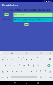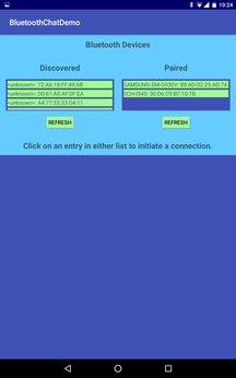 The app should be run on two separate devices. When started, it will display two lists: one for discovered devices and one for paired devices. Clicking on an entry in either list will cause the app to attempt to connect to that remote device. If the remote device is running this app, the connection will succeed and both devices will then display the chat UI and text can be sent and received. Clicking on "Done" on either device will terminate the session and both devices will return to the original screen. Bluetooth Chat Demo is rock solid. It handles all network activity (connection set up as well as chat communications) on background threads. Activities and threads are managed carefully, with no memory or thread leaks. Displays are maintained across device rotations, as are chat connections (even the official Android Bluetooth chat demo loses its chat connection when the device is rotated). The full set of source code as well as complete technical documentation are both available via the links below. |